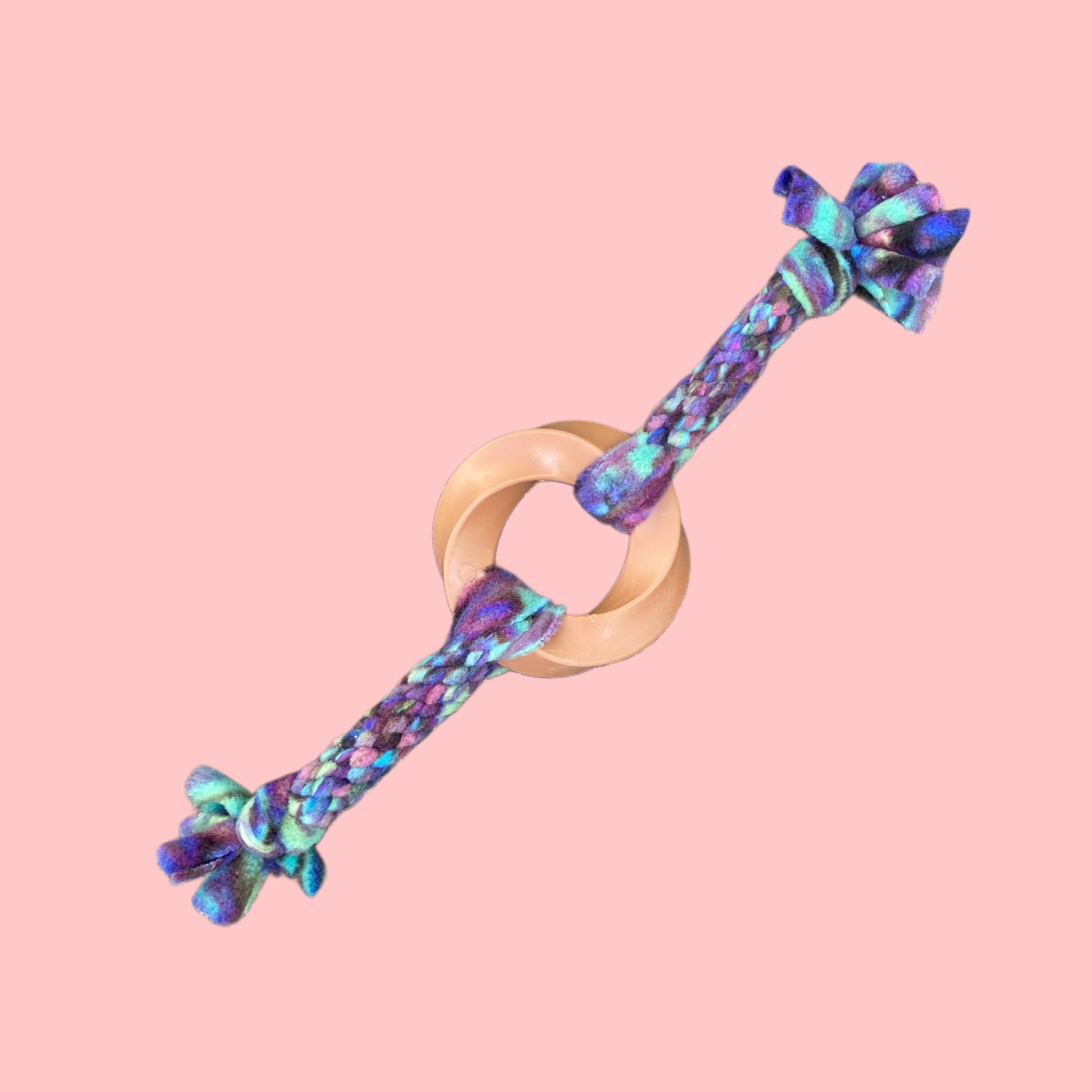 Flavoured dental chews braided into a tug with recycled second hand fleece